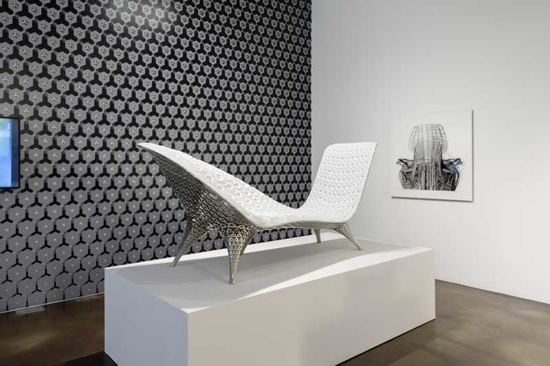 Microstructures Aluminum Gradient Chair (2014): The Aluminum Gradient Chair was directly laser sintered in aluminum, made using generative design tools (technology that almost automatically outputs appropriate designs with the input of computerized algorithms) and new materials research. The Aluminum Gradient Chair is engineered on a cellular level to address specific functional needs for different areas within the piece. The dense grouping of solid cells compose the rigid framework of the Aluminum Gradient Chair, while more open cells towards the surface create material reduction and lightness.