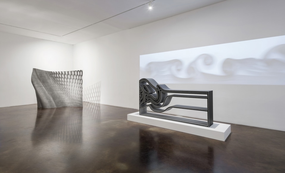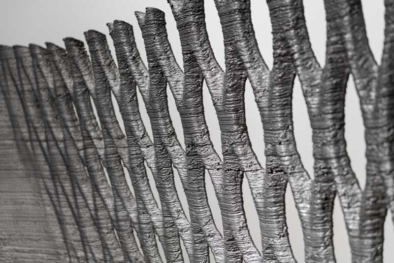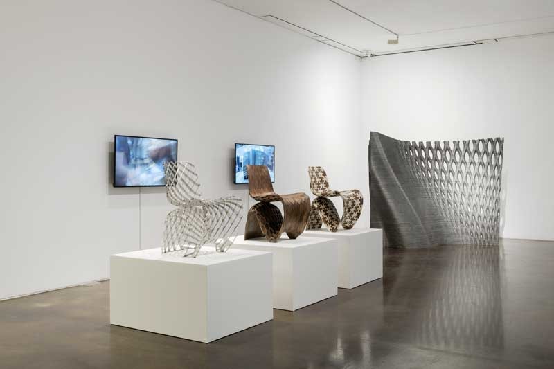 Gradients is comprised of works from all of the Lab’s recent series, including Microstructures, Dragon, Maker, and Gradient Screen. The Microstructures series is based on gradient patterning and explores the pioneering use of 3D printing technology at the scale of furniture. Each work is made up of cells that vary in form, size or function. For the Dragon Benches and Gradient Screen, the Lab developed a revolutionary large scale metal printing tool, the MX3D metal printer, enabling the Lab to create unprecedented sculptural works by drawing complex curved lines and surfaces in mid-air that were previously not feasible. Various versions of Dragon Benches are now in museum collections around the world, and serve as proof of concept for much larger architectural and infrastructural projects like the Lab’s first 3D printed stainless steel bridge—to be completed later this year. Laarman’s Maker series are built from parametric parts that are engineered to build furniture in complex organic forms and patterns from materials like solid wood. The Maker series has been included in over a dozen institutional collections and exhibitions to date.
