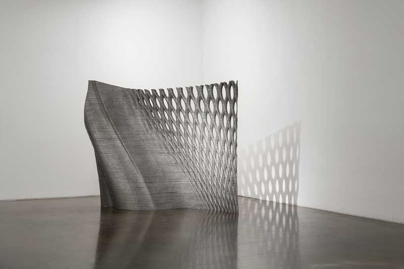 Gradient Screen (2017): The Gradient Screen is an experimental sculptural work of a grand scale produced with the Lab’s multi-axis, metal 3D printing tool MX3D, utilizing a variety of materials ranging from bronze to steel. The computationally generated aesthetic of the screen creates not only an artistic masterpiece but also pushes the boundaries of today’s technology. 3D printing of this scale has heretofore been uncharted territory, and the Lab continues to explore the potential of the 3D printing technology that employs the extensive use of lines.